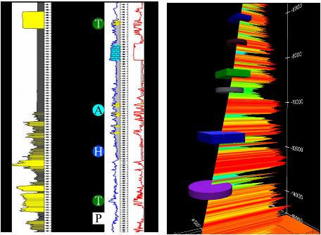 In Color Spectrum mode, click on an object to open a small box displaying the color spectrum of the object as a cylinder, and its associated values. This tool will help you quickly distinguish what colored objects represent, specifically when there are multiple colored objects being displayed. This tool works for log curves and surfaces. When you are in Color Spectrum mode, your cursor will look like a hand ().