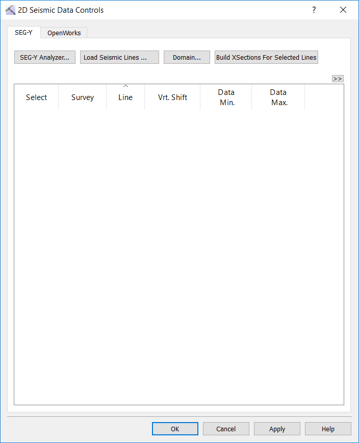 Use the buttons at the top of the tab to load seismic files, specify domain parameters, and create cross sections that correlate with the files.