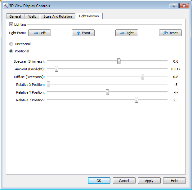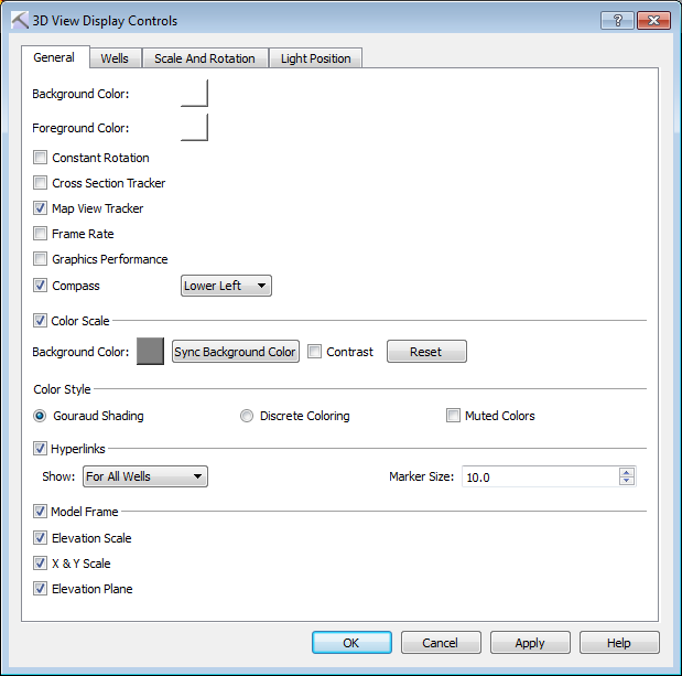 Show Compass: Display a compass in the specified location to help orient the 3D display. Choose from Lower Left, Lower Right, Upper Right, or Upper Left.