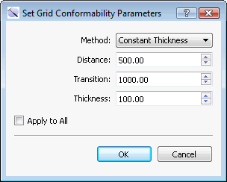 The Set Grid Conformability Parameters dialog box is used to specify the conform method when you are using conformable gridding to create surfaces. To open the Set Grid Conformability Parameters dialog box, from the Framework tab in the Surface Display and Data dialog box, click in the Conform Method cell. Alternately, click in the Conform Distance, Conform Transition, or Conform Thickness cell when the table view is expanded.