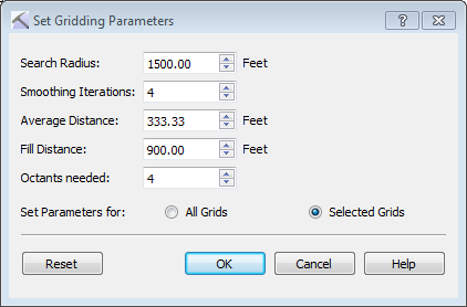 The Set Gridding Parametersdialog box is used to define the gridding parameters for all grids, a group of selected grids, or individual grids. These parameters are used in conjunction with the selected gridding algorithm and conform surface to produce the final surface. To open the Set Gridding Parameters dialog box, from the View menu in the Surface Display and Data dialog box opened in the 3D View window, select Gridding Parameters. Alternately, you can click on the Search Radius, Smoothing Iterations, Average Distance, Fill Distance or Octants Needed cell when the table view is expanded.