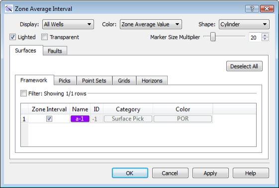 The Zone Average Interval dialog box is used to determine which zone average intervals are display in the 3D View window, and how they appear. Zone average values are calculated by taking the average of multiple log curve values over a specific zone. This dialog box displays all zone averages that are currently defined as overlays in the Surface Display and Data dialog box. The values can be displayed as cylinders or spheres on the wells in the display.