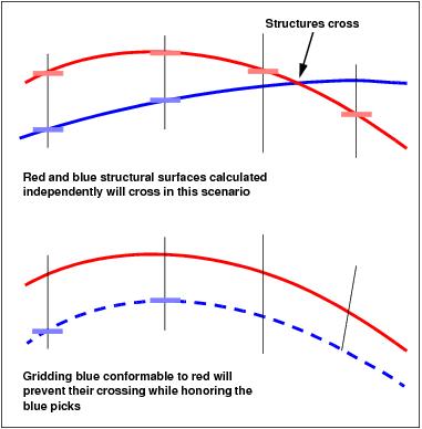In the example shown, when you choose to grid the blue surface conformable to the red surface, the difference in elevation of the blue picks and the back-interpolated elevation values of the red surface at the XY locations of the blue picks is calculated.