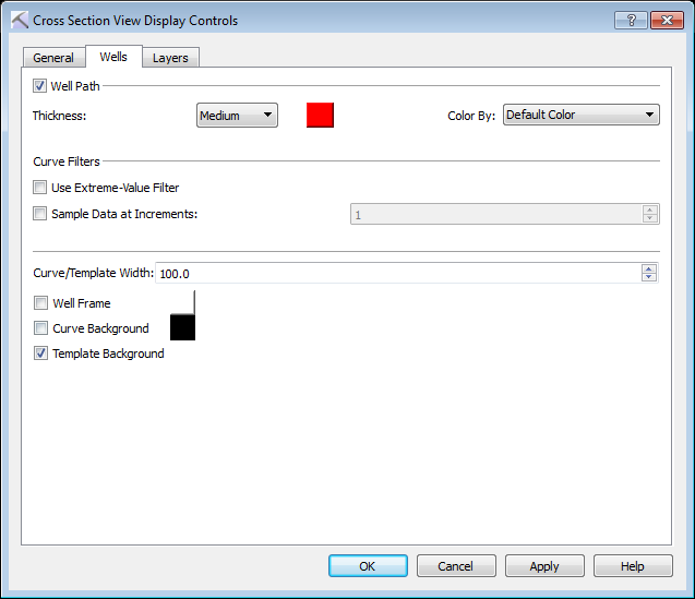 Wells Tab: Use the Wells tab to control the general appearance of the wells, curves, and templates in the cross section. See Wells tab options...