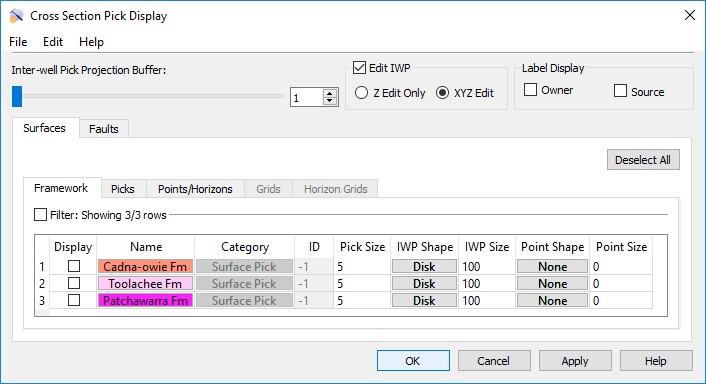 The Cross Section Pick Display dialog box is used select which surfaces and faults are being displayed in the cross section, and control how they appear. To open the Cross Section Pick Display dialog box, click on the Buttons toolbar, or from theView menu select Picks.