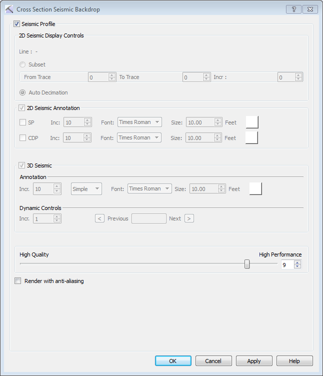 All of the display parameters, including the seismic profile you are displaying, are set in the 3D View window using the 2D Seismic Data Controls or 3D Seismic Data Controls; this dialog box is simply used to turn the backdrop on or off. The control settings are displayed in this dialog box for information only, and can't be edited. To display a seismic backdrop, you must turn on Distance Spacing on the Scale tab in theCross Section Scale dialog box.