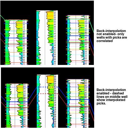 Back Interpolate: Turn on back interpolation to display interpolated picks on wells that don't contain a pick for the surface you are displaying. Back interpolated picks appear as dashed lines on the well template and log curves, and are based on the intersection of surfaces calculated from the interpreted picks. Back interpolation is only applied when you are using fixed spacing.