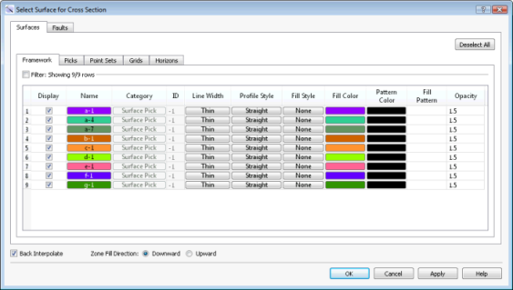 Use the Surfaces and Faults tabs to select the surfaces and faults you want to display in your cross section, and adjust their display properties. You can turn on data from any tab. Each tab contains the associated display options for each data type, as well as informational fields that can't be edited. You need to move data to the Framework tab from the Surface Display and Data dialog box in the3D View window.