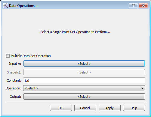 Use the Data Operations dialog box to perform mathematical operations on one or more data sets. The output is saved as a surface horizon/points, or a fault point set. To open the dialog box, from the Tools menu in the 3D View, Map View or Grid View window, select Data Operations.