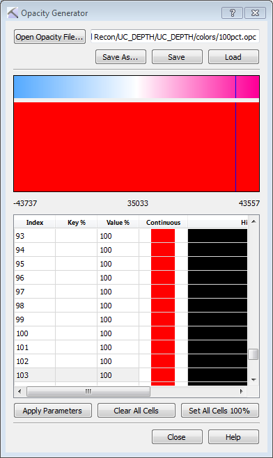 You can manually enter opacity values and ranges in the opacity spectrum table, or you can use your cursor to select the opacity values and ranges on the opacity spectrum graph at the top of the dialog box.