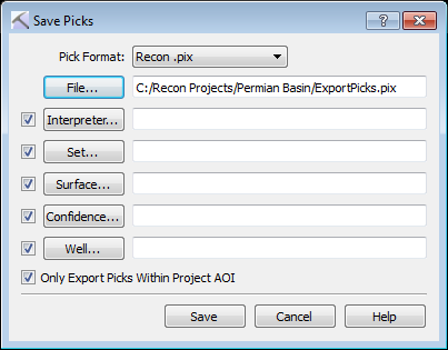 The Save Picks dialog box is used to save a group of picks to a .pix file, a columnar ASCII file that can also be used in other applications. You can save all of your picks, or use the qualifiers to limit the data being exported.