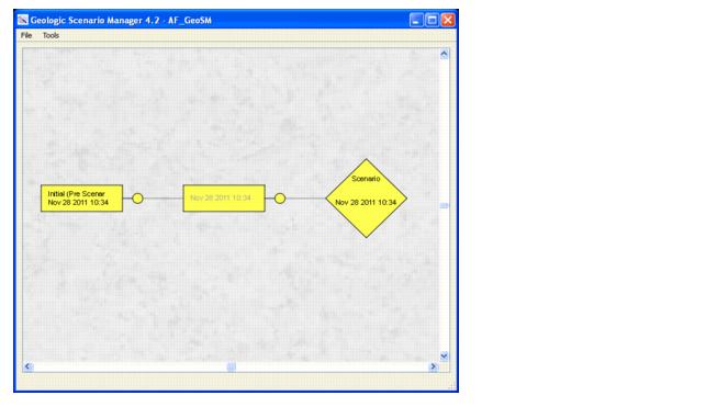Sessions are represented by rectangles. The first time you open the Geologic Scenario Manager you will create an initial session whose audit trail contains a record of all of the data currently in the project. You will also see another session, where any additions, deletions, and changes will be recorded as you continue to work in your project. The text in the second session symbol will appear grayed out until any changes are recorded.