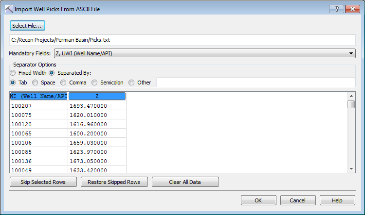 You can import well picks from any columnar ASCII file. The file must have a column containing the UWI/Well Name/API, used to associate the pick will a specific well, and a Z value corresponding to the pick surface. Optionally you can label Surface Name, X, Y, Interpreter, Category, Dip, and Azimuth columns.