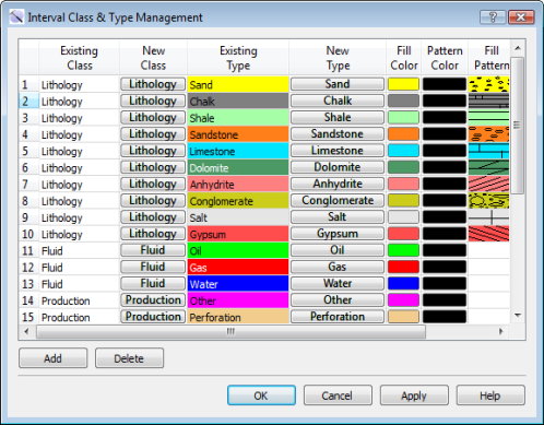 Use the Interval Class and Type Management dialog box to add and edit Interval Class and Interval Type information, including colors and fills. You can open this dialog box from the Edit menu in the Interval Display Controls dialog box in the 3D View window.