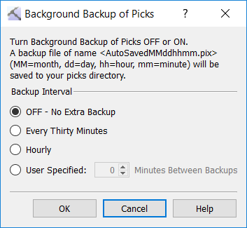 User Specified: Enter a value in minutes. Picks are back up at this interval, and a new .pix file is created.