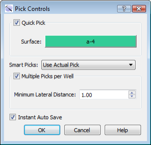 The Pick Controls dialog box allows you to turn on Quick Pick mode, select the surface to pick, and control how pick interpretations are placed and saved. You can open this dialog box by clicking