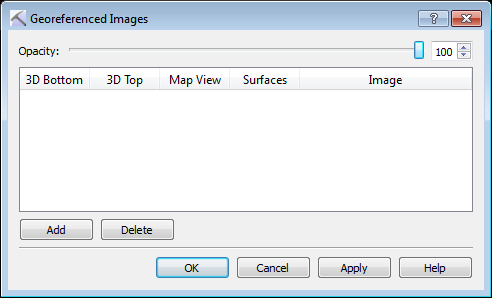 The Georeferenced Images dialog box is used to turn on images in the 3D View or Map View windows, and to access the Import Georeferenced Image tool. used to add new image files to the project. To open this dialog box, from the View menu in the 3D View window or the View menu in the Map View window, select GeoImage.