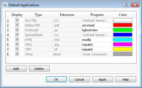 The Default Applications dialog box displays a list of allowable file types and default applications associated with the hyperlink objects added in the 3D Viewwindow, the hyperlink objects added in the Cross Section View window, and the hardcopy print preview. You can edit or delete the default file types and applications, and add new ones. Open the Default Applications dialog box from the Edit menu in the 3D View and Cross Section View windows. Note that the options selected in this dialog box will be applied throughout the project.