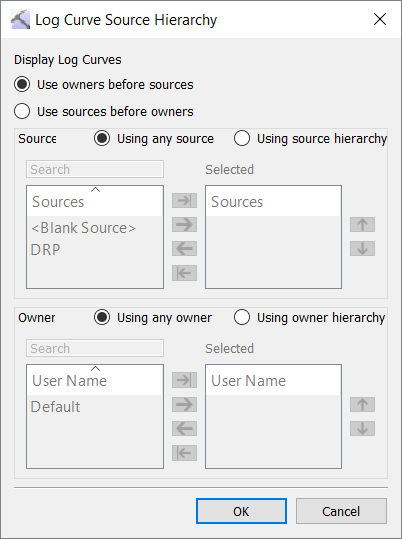 The Log Curve Hierarchy dialog box is used to determine which curves will be displayed when there are multiple curves associated with a well. Hierarchy can be set based on the source or the owner of the curve.