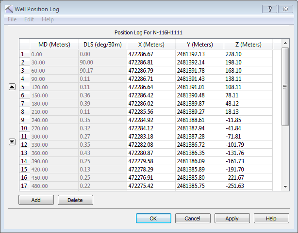 The Well Position Log dialog box allows you to view and edit the positional information from the well currently displayed in the View Well dialog box. To open the dialog box, from the View Well dialog box, click .