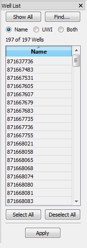 Well List: A list of wells in the project. The number of wells currently in the well list, and the total number of wells in the project are displayed above the list. To manually select or deselect a well from the well list, click in the cell. Note that you need to apply click to apply well selections to display windows and dialog boxes.
