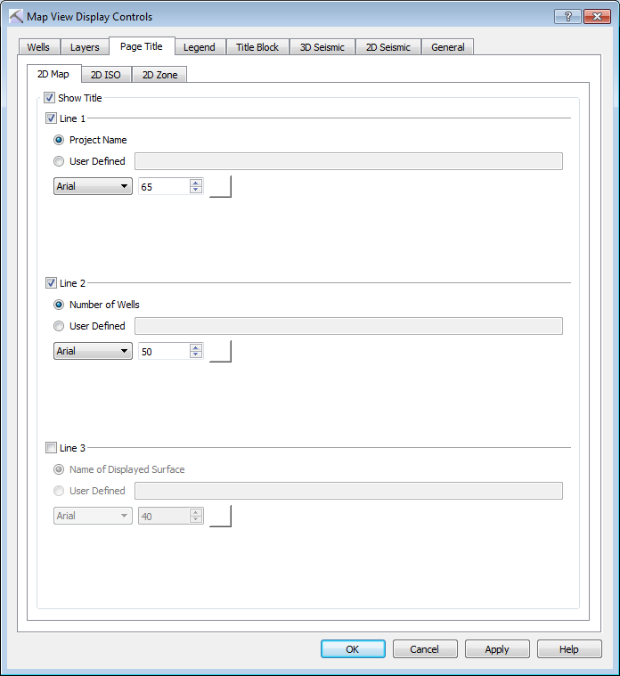 Page Title Tab: Use the Page Title tab to create and manage the title that will appear at the top of the map display. There are three tabs (2D Map, 2D ISO, and 2D Zone) which contain the same options, but allow you to display different title information depending on the type of surface you are displaying (surface, isochore, or zone average). Note that the page title can't be moved, it is centered at the top of the map display.