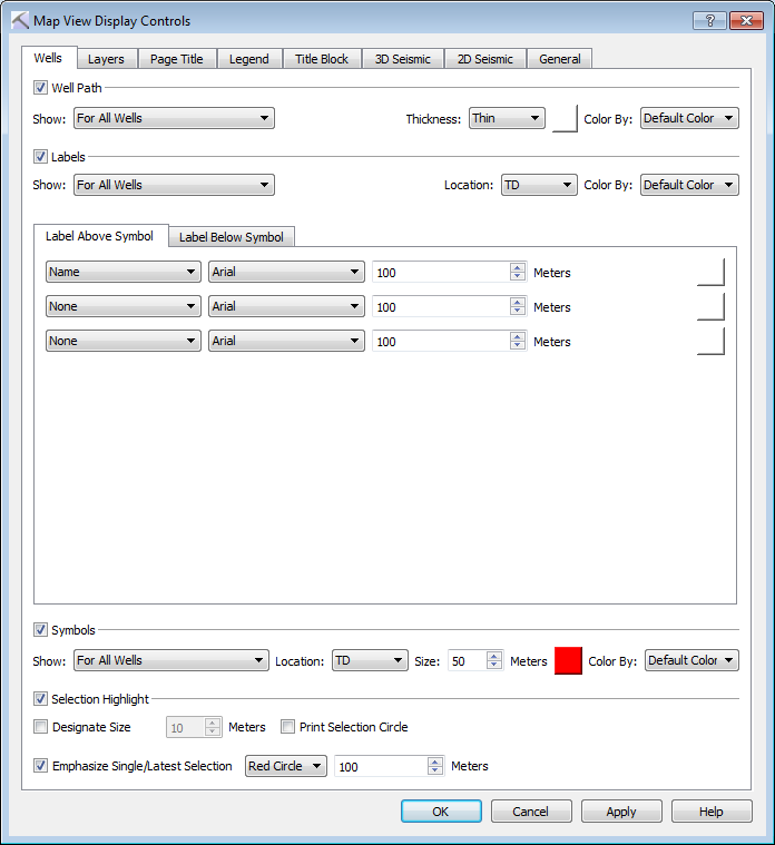 The Map View Display Controls dialog box is used manage general display properties, control the appearance of wells and templates, determine which layers are actively being displayed in the Map View window. To open the Map View Display Controls dialog box, on the Buttons toolbar click
