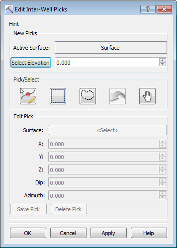 The Edit Inter-Well Picks dialog box is used to create new inter-well picks, change the location of inter-well picks, and change the location and depth information associated with inter-well picks. From here you can also delete existing picks. To successfully create new picks, select a surface to display from the Select Surface for Map View dialog box. To successfully edit picks, you should also turn on the pick display from the Map View Pick Display dialog box. Once a surface and/or picks are being displayed, to open the Edit Inter-Well Picks dialog box, from the Mode toolbar, click the Inter-Well Pick Mode icon (