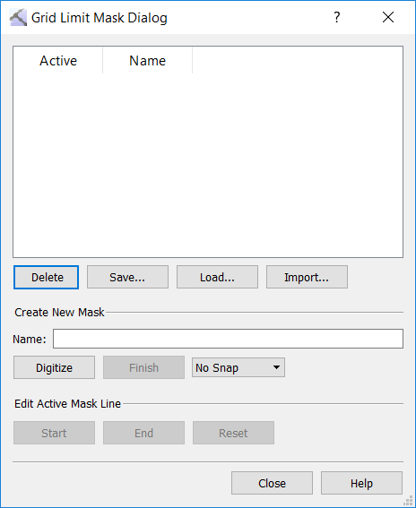 The Grid Limit Mask dialog box is used to create and edit grid masks, and to select an active grid mask. Grids masks are closed polygons that represent reservoir field boundaries, and are applied to structural surfaces, isochore maps, and zone average maps to limit the extrapolation of grid values to the edge of the project limits. Data outside of the grid mask is hidden. To open the Grid Limit Mask dialog box, from the Buttons toolbar, click.