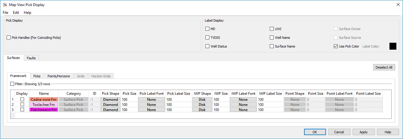 Use the Map View Pick Display dialog box to determine which surface picks, fault picks, and inter-well picks will appear on the map, and manage their appearance. To open the Map View Pick Display dialog box, on the Buttons toolbar click , or from theView menu select Picks.