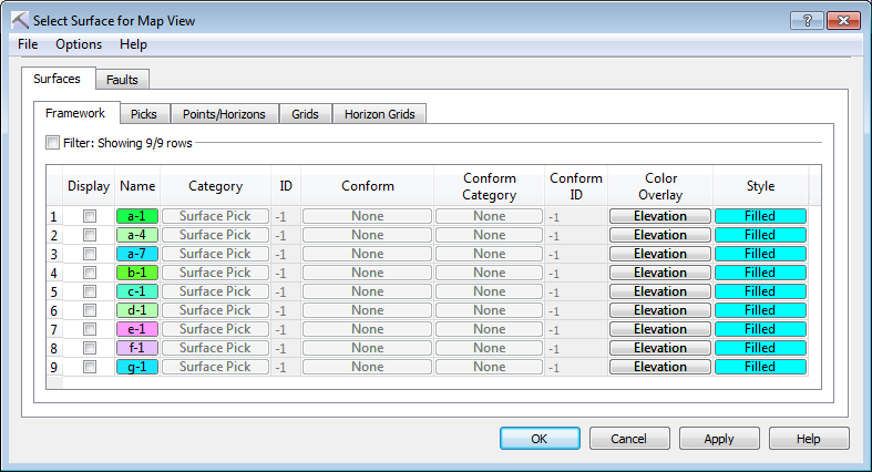 Use the Surfaces and Faults tabs to select the surfaces and faults you want to display on the map, and adjust their display properties. You can turn on data from any tab. Each tab contains the associated display options for each data type, as well as informational fields that can't be edited.