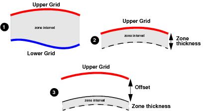 There are three methods for determining the zone average interval using an upper and lower surface, and upper surface and a thickness, or an upper grid, an offset and a thickness.