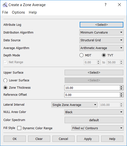 Attribute Log: Click to open the Select Curve Data dialog box and select the log curve or substitute curve to be averaged. The zone average map will be scaled and colored using the minimum and maximum values defined for each attribute log.