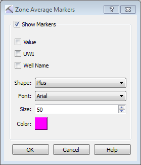 MD: Calculate a series of zone averages based on a user-specified sampling distance along the measured depth of the well trajectory. This is typically used for horizontal wells that enter the zone once and remain within the zone for some distance. Enter a value for the sampling distance in the field provided. In Map View, the spacing of the zone average markers will vary from well to well due to differences in orientation of the well trajectories.