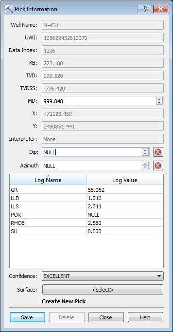 The Pick Information dialog displays detailed well data for the current pick location in the Well View window. Most of the data is informational, however you can use this window to change the measured depth of an existing pick, add Dip and Azimuth data, apply a confidence rating, and create a new pick surface.