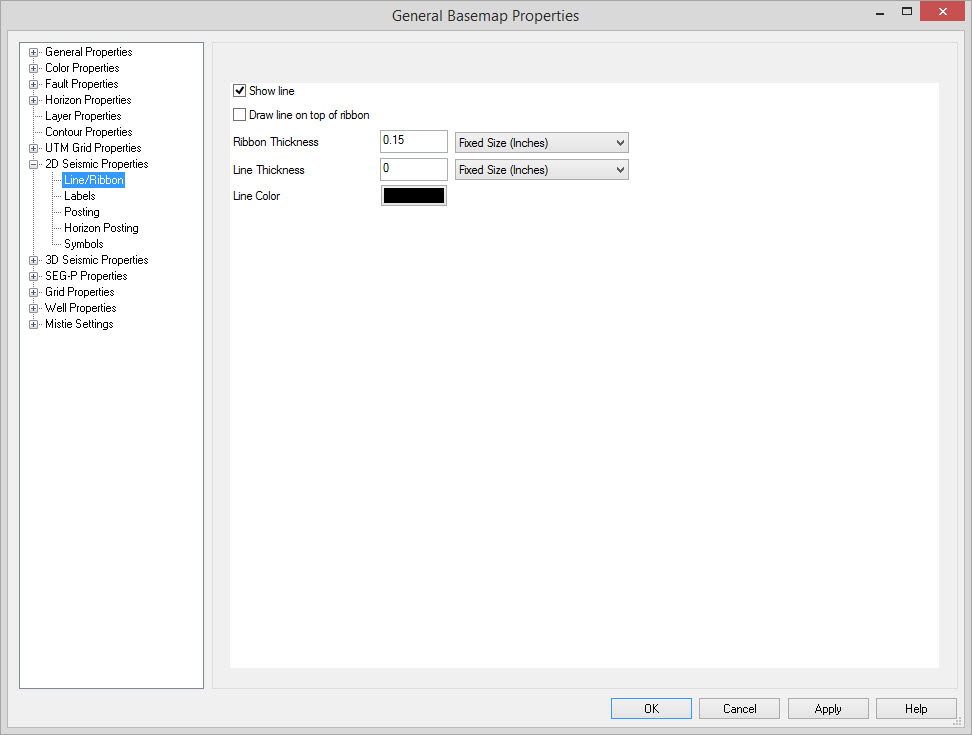 Geoscience > Main Launcher > Launch Menu > Basemap > General Properties > 2D Properties > Line and Ribbon
