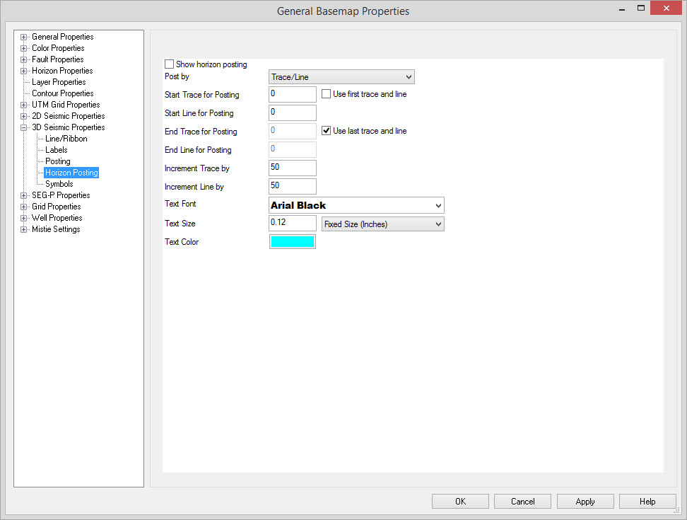 Start Trace for Posting, Start Line for Posting/End Trace for Posting, End Line for Posting/Increment Trace By, Increment Line By: The starting, ending, and increment posting values for the trace and line parts of a 3D survey. The value entered here should be appropriate to the selection in "Post By". Generally, using the first and last line/trace for posting is the best application for all lines. If using line-by-line properties, you can have values specific to that line.