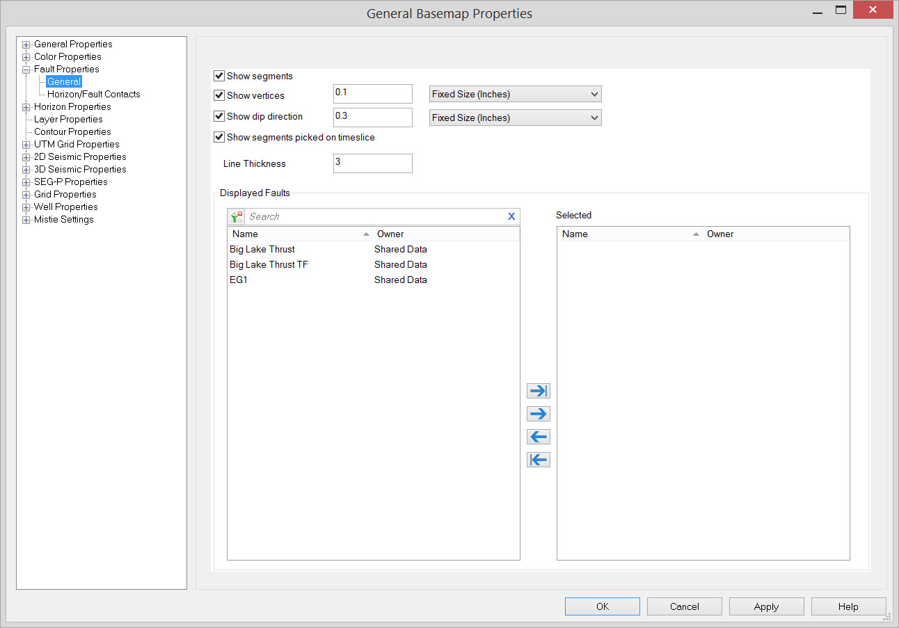 Select the faults that you want displayed on the Basemap. Left click to select a fault, or use the Ctrl key on your keyboard to select multiple faults, and then use the selection arrows to move the faults to the Selected list. Alternately, you can move a single fault to the Selected list by double clicking on it.