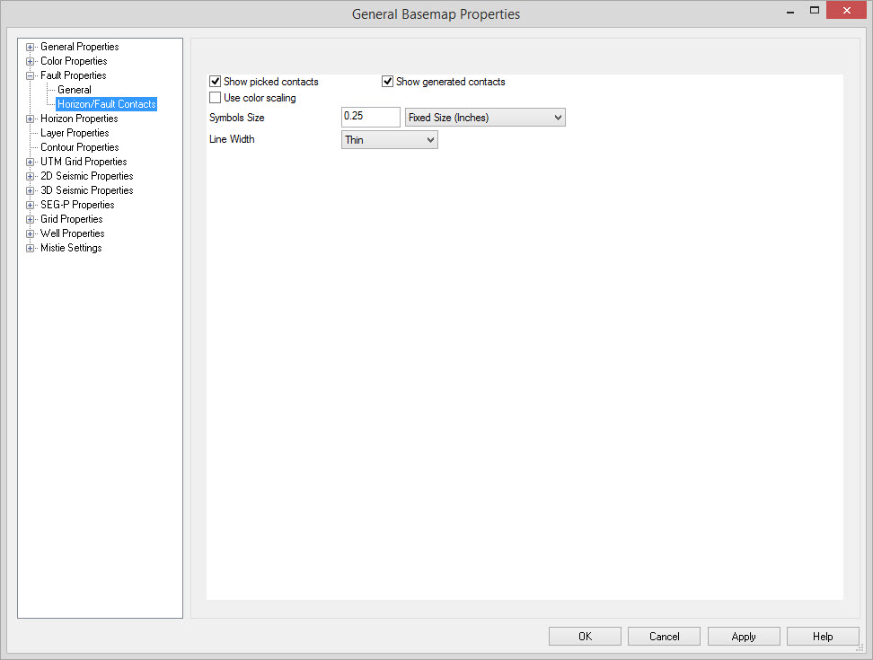 This page controls the appearance of horizon/fault contacts on the Basemap. A contact will only be drawn for a fault when the horizon it intersects is being displayed. If there is only one contact point between the fault and horizon, the horizon/fault contact will draw as a circle. If there are multiple horizon/fault contacts, they will be drawn as an arrow head pointing in the dip direction of the fault segment.