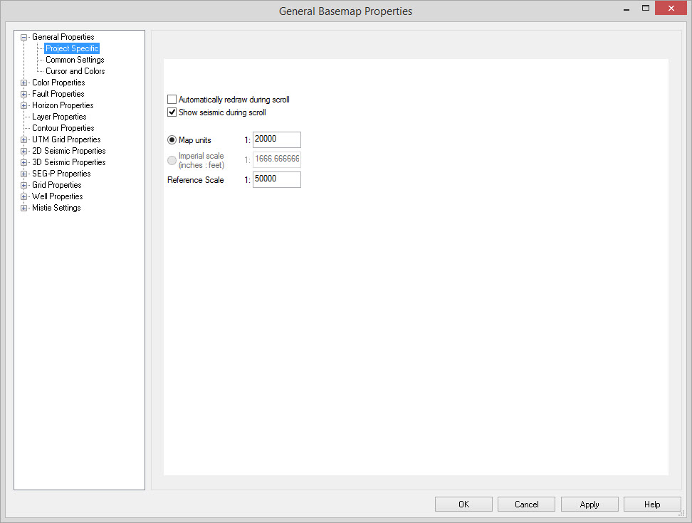 Geoscience > Main Launcher > Launch Menu > Basemap > General Properties > General Properties > Project Specific