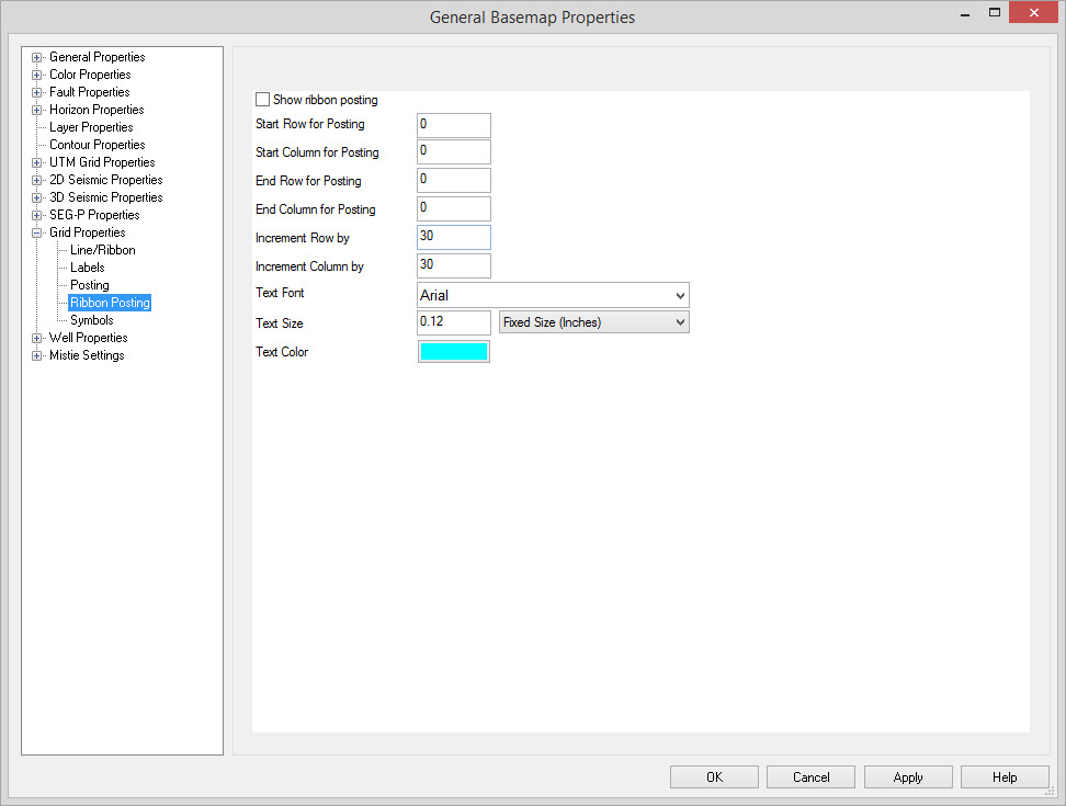Geoscience > Main Launcher > Launch Menu > Basemap > General Properties > Grid Properties > Ribbon Posting