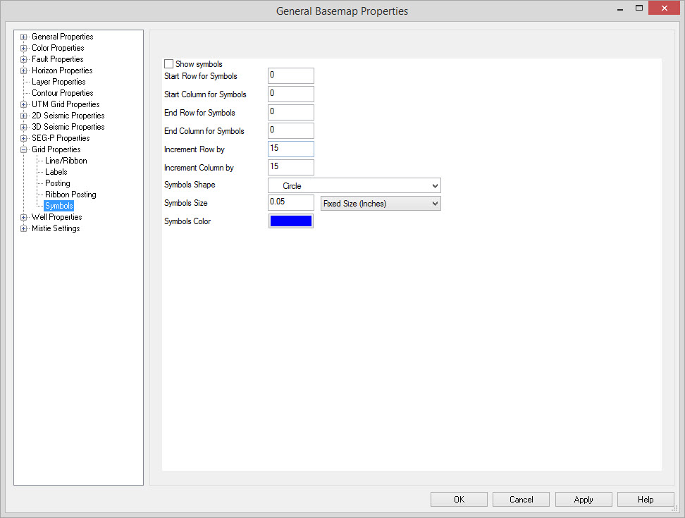 Geoscience > Main Launcher > Launch Menu > Basemap > General Properties > Grid Properties > Symbols for Grids