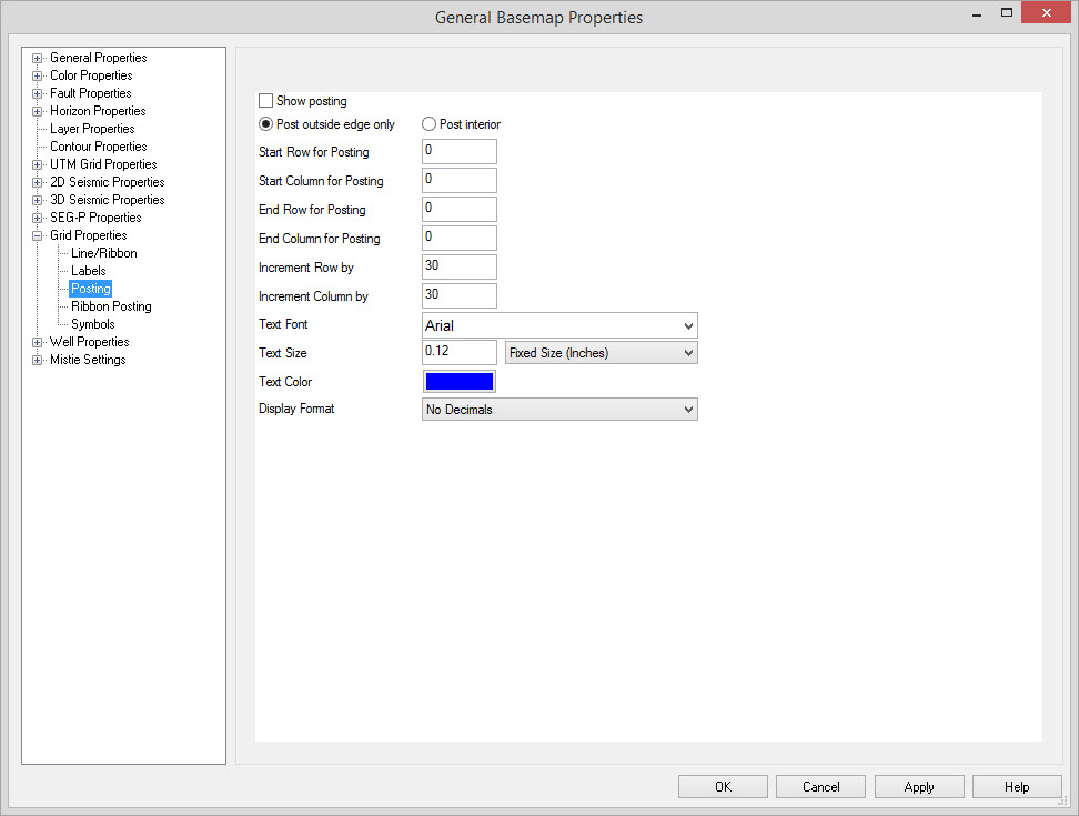Geoscience > Main Launcher > Launch Menu > Basemap > General Properties > Grid Properties > Posting on Grids