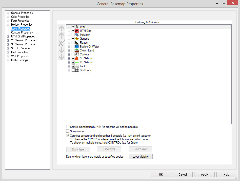 Layers are grouped according to type and you can reorder the layer groups. The topmost layer is drawn on the top and the layers are drawn in the order selected. Within each group, individual items will be listed so individual layers can be turned on, off or reordered within the group (the exception being 2D Seismic).Show Owner: When enabled, the owner of the data is displayed in brackets next to the data. This only applies to individual data items. For example the generic item Wells will not have any owner information, however an individual grid will.