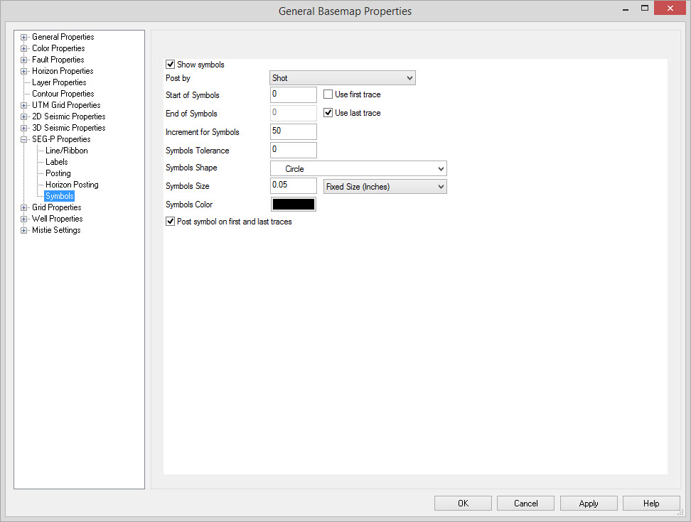 Geoscience > Main Launcher > Launch Menu > Basemap > General Properties > SEG-P Properties > Symbols for SEG-P