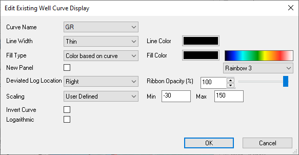 New Panel: If enabled, this curve will be drawn into a new track beside the previous one. Thus, if you want two resistivity curves in the same track, and a sonic in a track beside the resistivity curves, you need to ensure "New Panel" is checked on for the sonic curve. Also ensure that the first resistivity curve is also checked on and the second curve has it checked off. Ensure that you add the resistivity curves first.