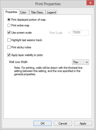 the map visible in the window. Use screen scale: If the toggle to Use screen scale is checked then the current scaling of the Basemap is also used for printing. If unchecked then a Print Scale must be specified. Highlight last seismic track: When turned on, this feature will keep the last piece of seismic that was tracked highlighted on your map. Print sticky notes: Remove Sticky Notes from plots without turning them off in Layer Properties. Apply layer visibility to plots: When printing at a different scale that the screen scale this may change the data being displayed on the plot due to Layer Visibilitysettings. When turned of the plot won't differ from the current Basemap view. Well Line Width: This will enhance the width of wells for printing only. Select from Thin, Medium, Thick and Fat. |