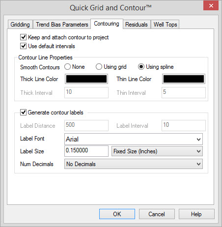 results will not be preserved. Use default intervals: If toggled on, the software will estimate an appropriate contouring interval. Turn off to manually specify the contouring intervals. Smooth Contours: Indicates whether the contour should be smoothed or not. A smoothed contour will have more control points in it. You have the option to smooth a contour using a spline or using a grid method. When using a grid to smooth the line, the original grid is resized to 5 times its original size and then the contours are generated as normal, which produces a smoother line because the grid is finer. Using a grid to smooth the contours means that you will not get overlapping contours or loops happening where there are cusps in the contour line. Label Interval: Interval value for each contour to be labeled. Typically, users set this to the same value as "Thick Interval". It is a good idea to set this to a multiple of "Thin Interval". |