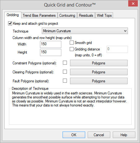 be saved. Technique: Select the desired algorithm. A brief description of the algorithm is provided under "Description of Technique". For more information refer to the Gridding Techniques in the Grid and Contour help. Column width and row height: Specify the column width and row height in map units. this is either meters or feet depending on the coordinate system being used. Smooth grid: Enable this to use a smoothing algorithm to eliminate spikes in the grid. Gridding distance: The farthest distance the output grid will extend from any seed data point. When gridding 2D data or irregular 3D data this can be used when you don't want to fill in all the gaps. This value is specified in map units, usually meters. Constraint Polygons (optional): Use this option to specify a region of seed points to use for the grid. If using an Inclusion/Constraining Polygon only the seed points within the polygon will be used to create the grid. If using an Exclusion/Constraining Polygon only the seed points not within the polygon will be used. This polygon will not affect the size or shape of the output grid. Clearing Polygons (optional): Once the grid is created this polygon will be applied to clear parts of the grid. If using an Inclusion/Constraining Polygon all parts of the grid will be cleared except for what is within the polygon. If using an Exclusion/Constraining Polygon everything will be kept except for what is in the polygon. Fault Polygons (optional): Use this option to define fault regions. When gridding seed data points that are across a fault they are ignored and not used to determine grid values. |