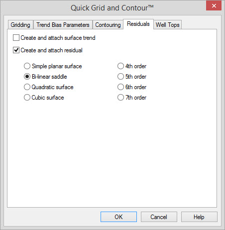 surface will match the seed points. Create and attach residual: A residual surface is the difference between the trend surface and the gridded surface. The residual surface can show anomalies between the gridded surface and the trend surface. Trend surface polynomial order: The order of the polynomial that will be used in generating the trend surface. The higher the order, the more closely the trend surface will match the seed points. Also, the higher the order, the longer it will take to calculate the trend surface. |